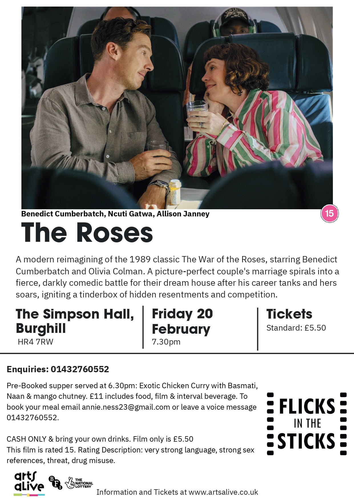 Pre-Booked supper served at 6.30pm: Exotic Chicken Curry with Basmati, Naan & mango chutney. £11 includes food, film & interval beverage. To book your meal email annie.ness23@gmail.com or leave a voice message