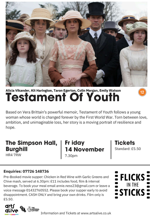 Chicken in Red Wine with Garlic Greens and Chive mash, served at 6.30pm: £11 includes food, film & interval beverage. To book your meal email annie.ness23@gmail.com or leave a voice message 01432760552. Please book your supper early to avoid disappointment. CASH ONLY and bring your own drinks. Film only is £5.50